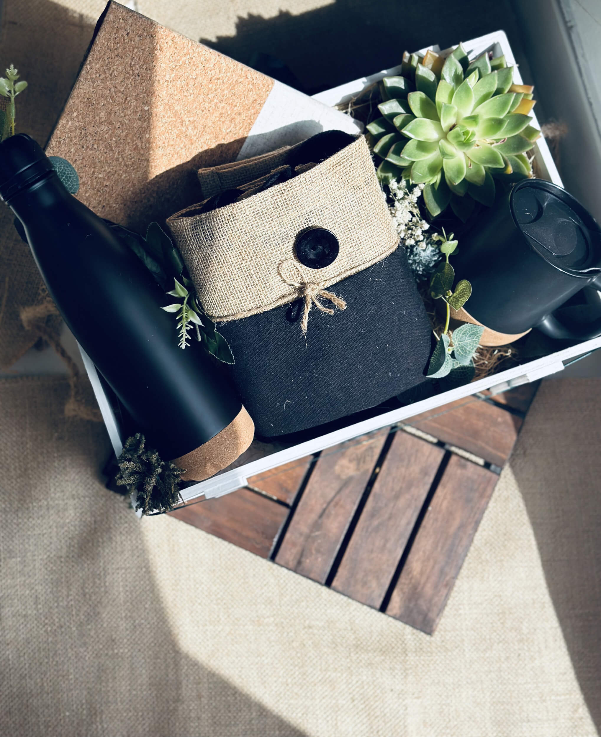 | Eco-friendly Sustainable Hamper | Eco-friendly tumbler with silicon lid 385ml Eco-friendly water bottle 500ml A5 Hard Cover notebook & pen Jute Tote BagĀ Succulent plant Wooden crate (32cmx22cmx12cm) |