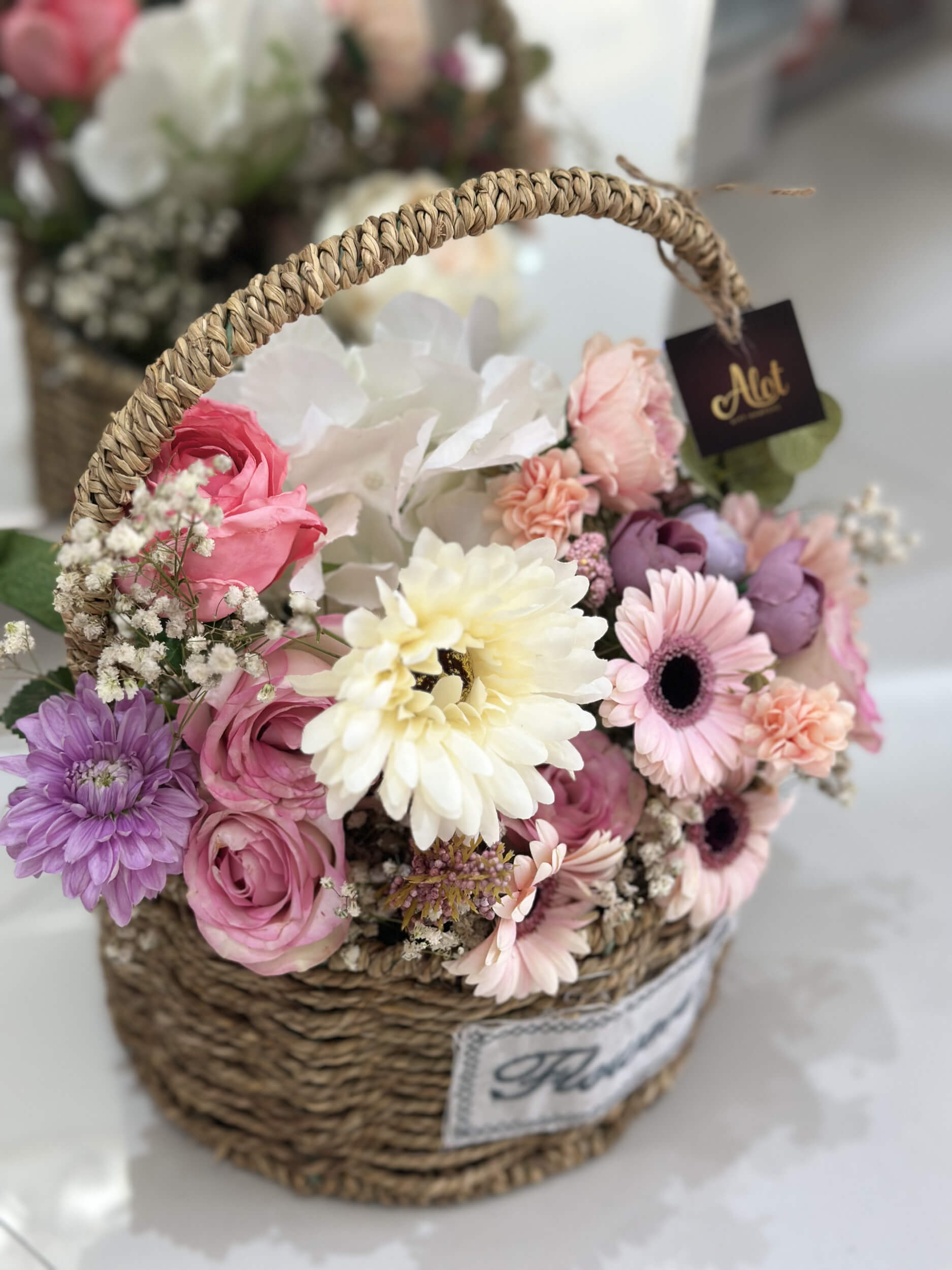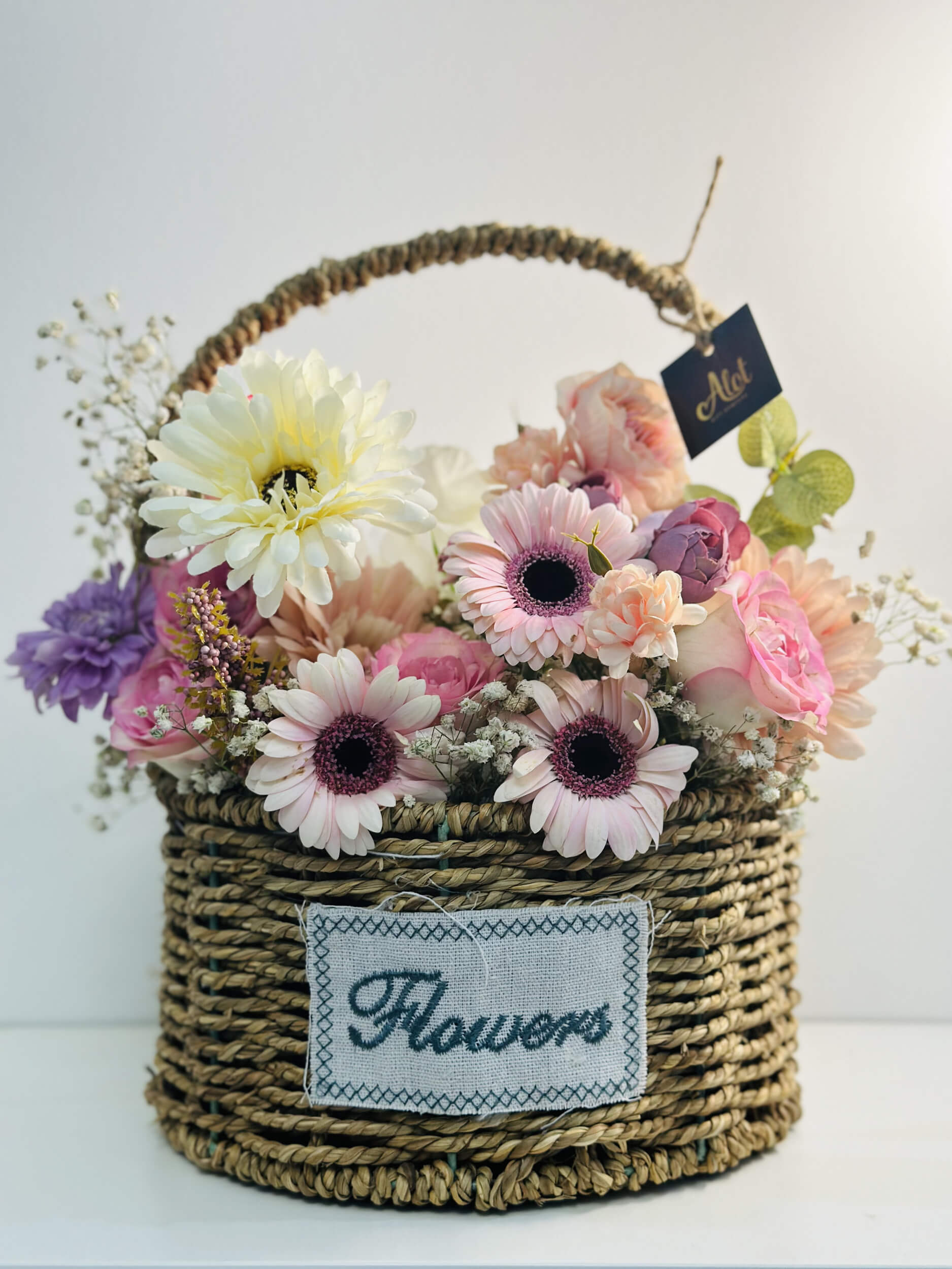 | Flower basket | 3 Pink Gerbera flowers 1 white gerbera flower 1 lavender crysanthemum 4 pink Roses 2 small peonies Gypsum flowers 1 Flower basket |