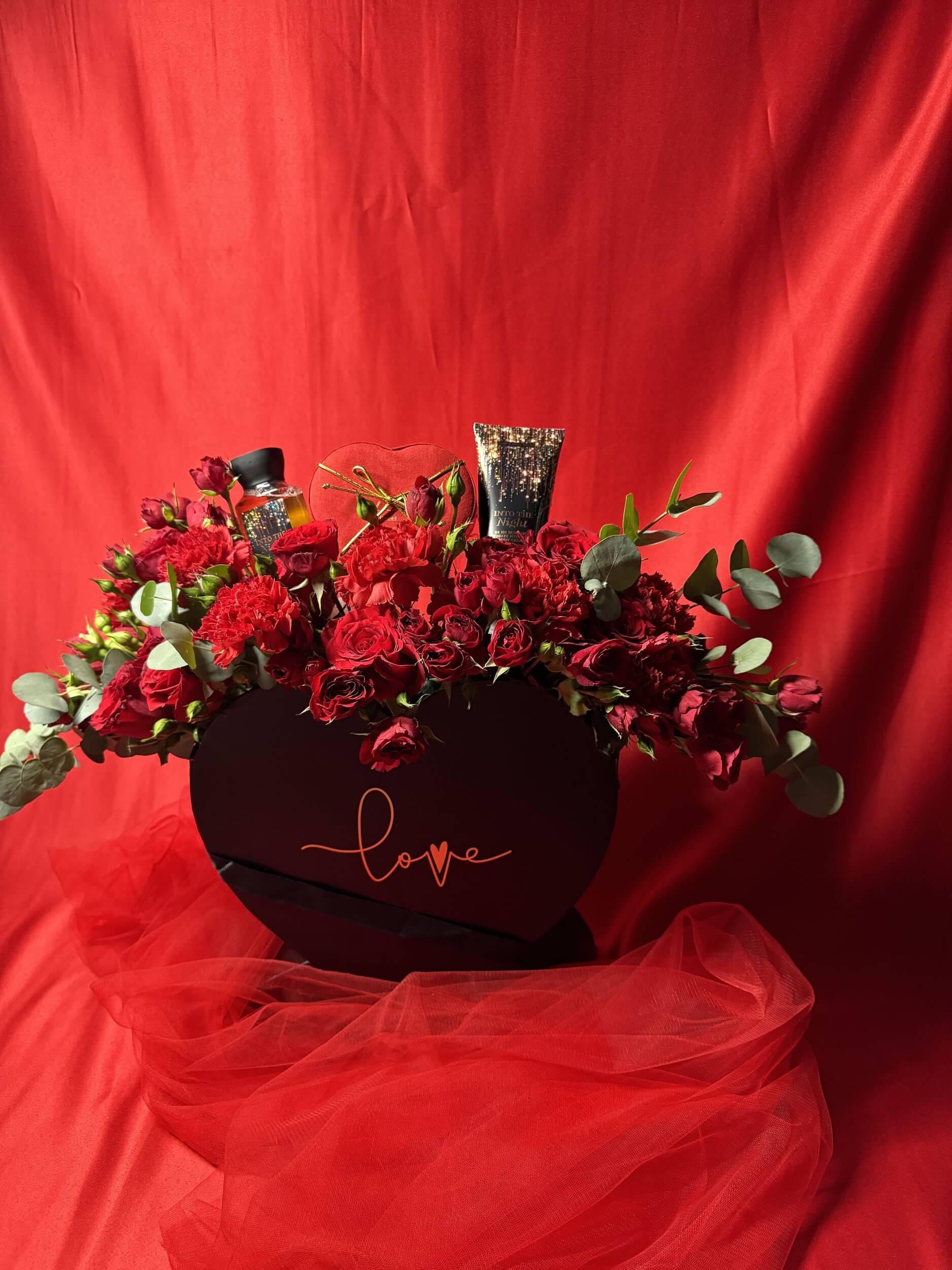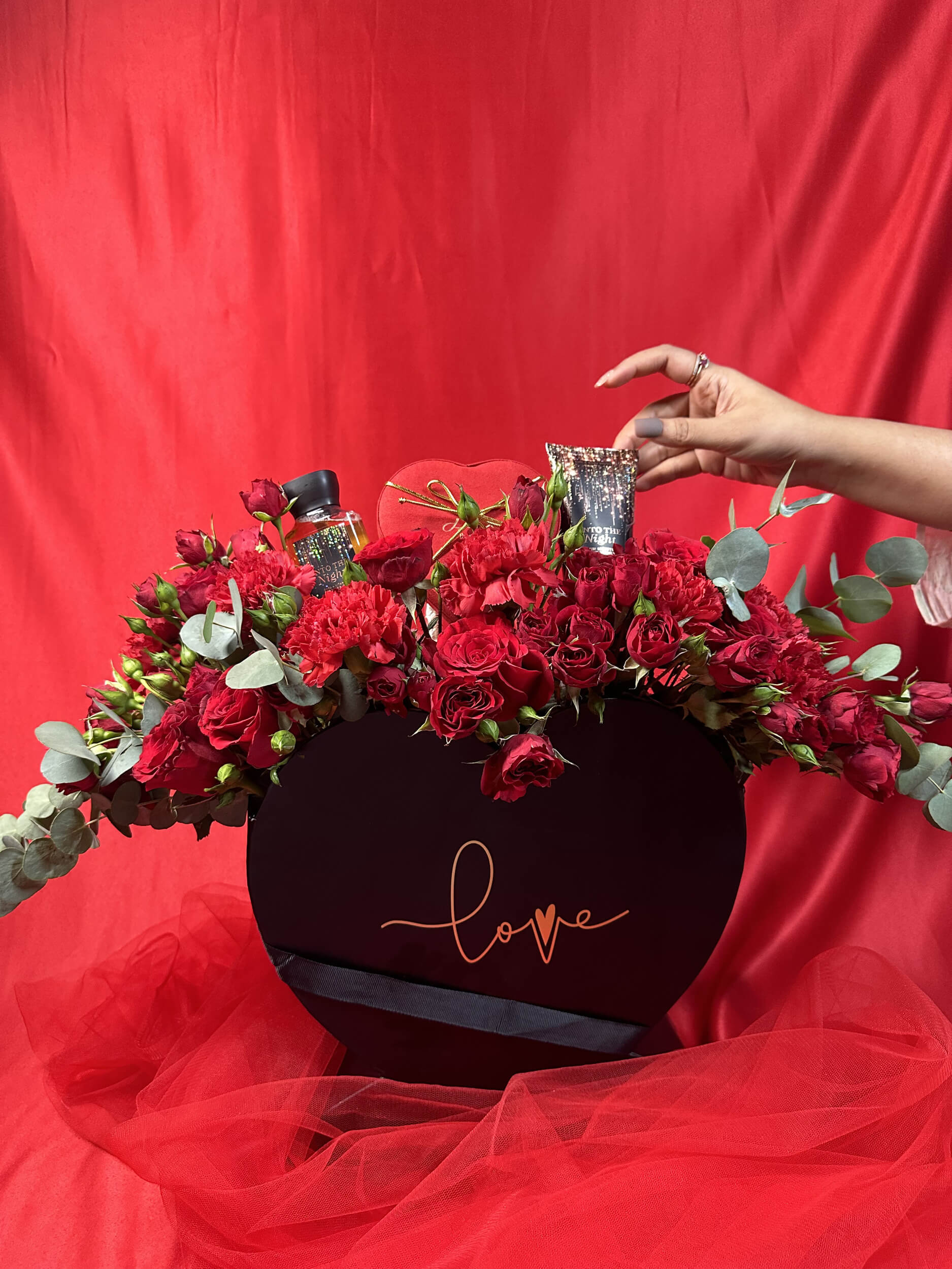 | Hamper of Desire | Hard cover black box 8 RedRoses 7 Baby Roses 7 Carnation Bath & Body Body cream 70g Bath & Body Shower gel 88ml Bateel premium Dates |