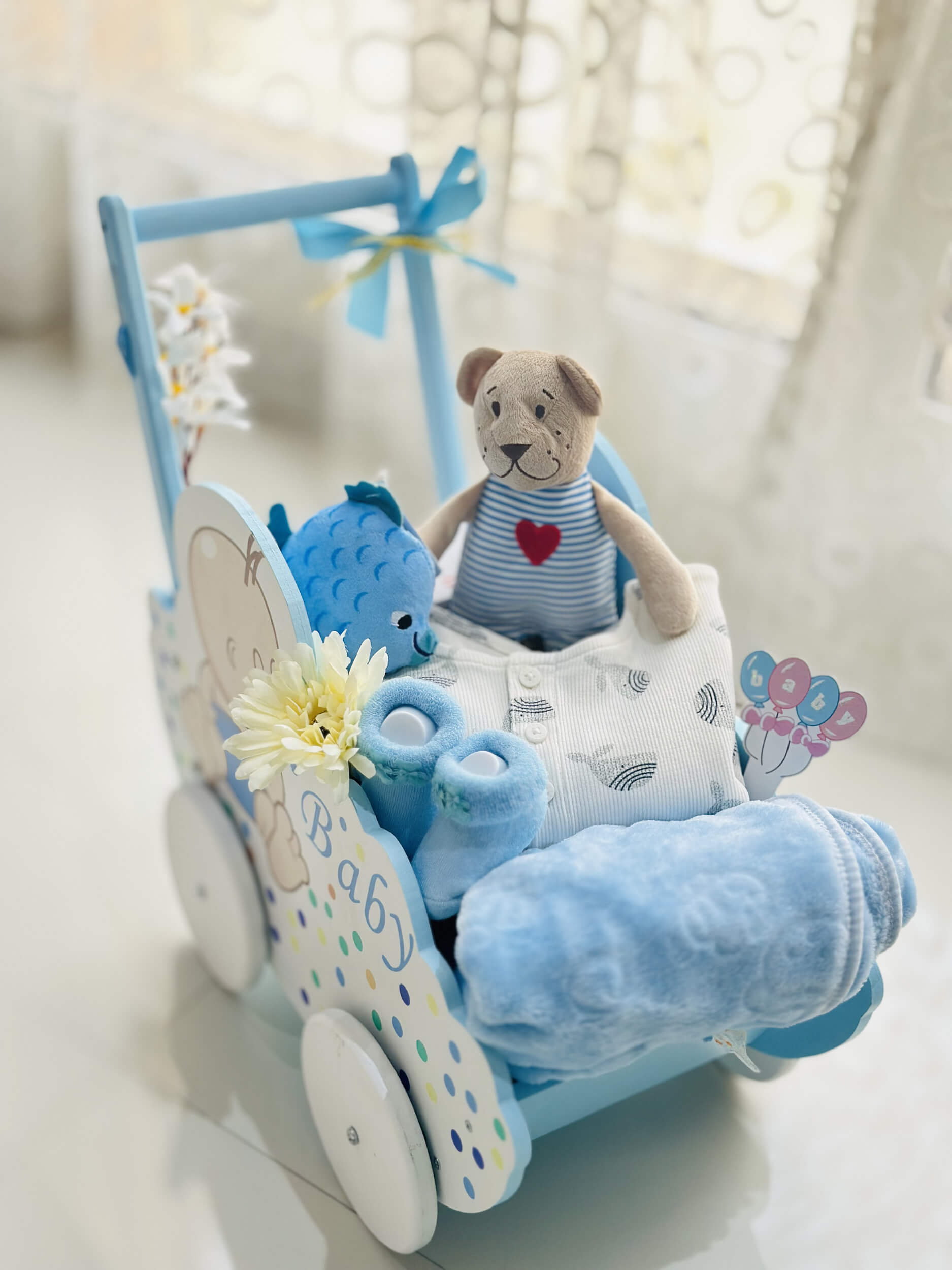 | oh baby | Wooden Baby pram 1 Pair of baby dress 1 Baby blanket 1 Fish soft toy 1 Teddy soft toy Floral decorations |