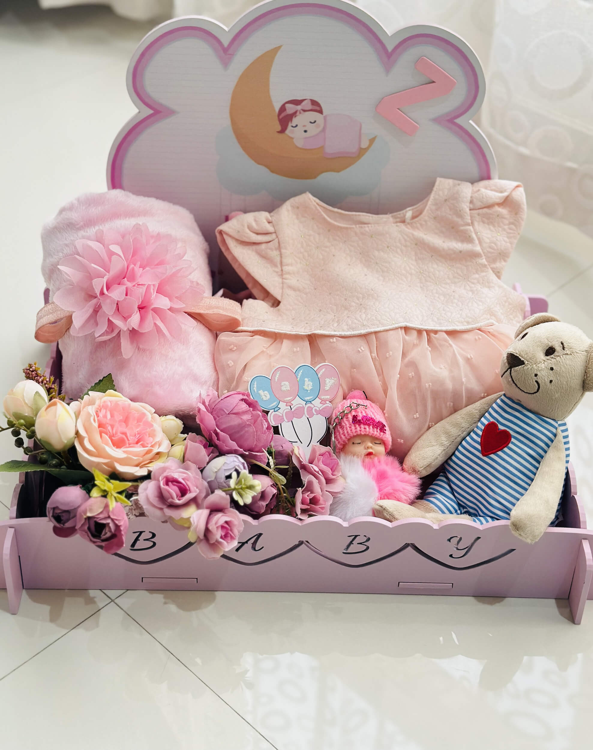 | Oh baby girl | Pink wooden tray 1 Baby girl dress 1 Baby blanket 1 Baby hair accessory 1 Teddy soft toy 1 Baby keychain Floral decorations |